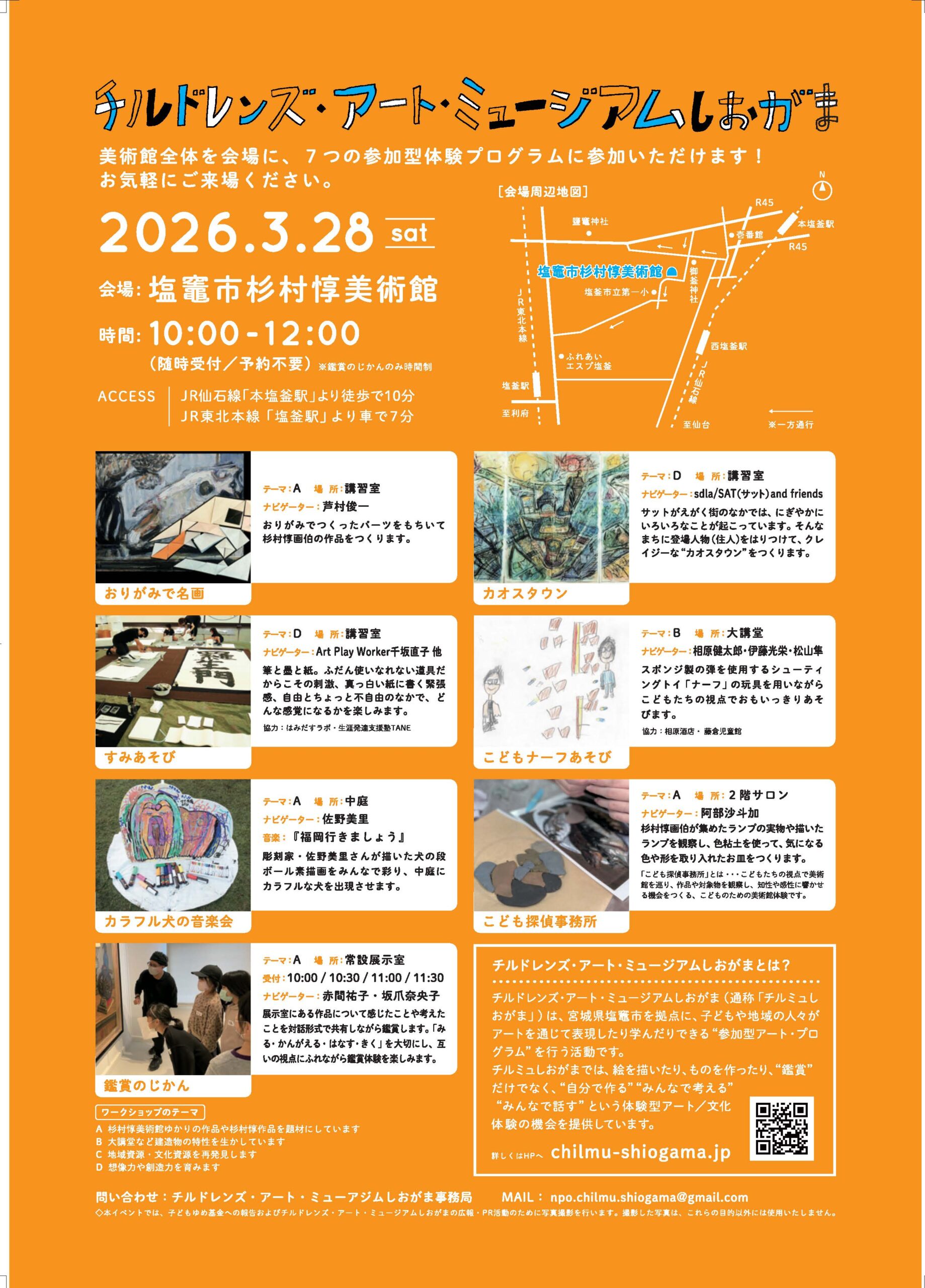 チルドレンズ・アート・ミュージアムしおがま(通称「チルミュしおがま」)は、宮城県塩竈市を拠点に、子どもや地域の人々がアートを通じて表現したり学んだりできる“参加型アート・プログラム”を行う活動です。