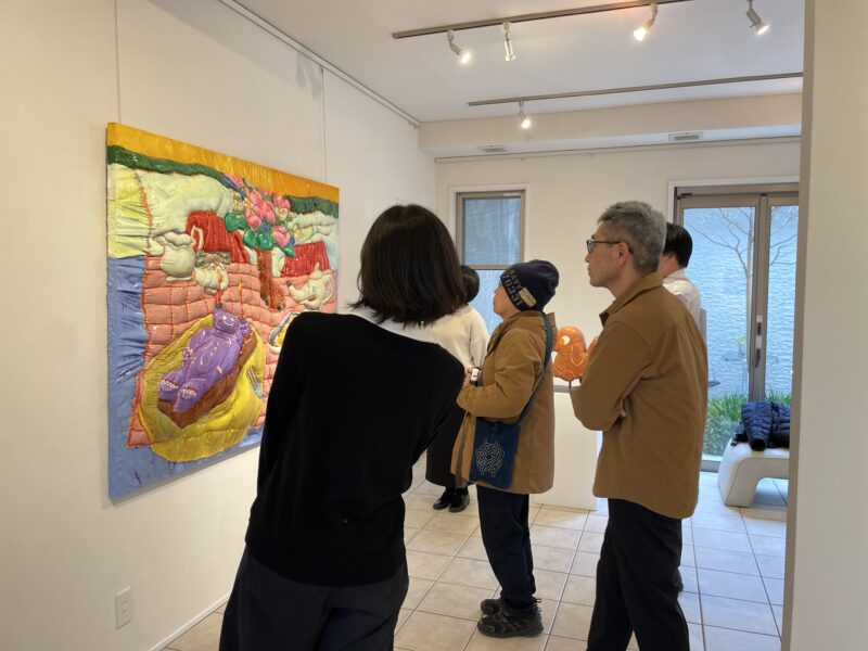 写真は1月に開催した青山夢さんの個展での鑑賞の様子です。立体感のある素材にも注目し、会話が弾みました。